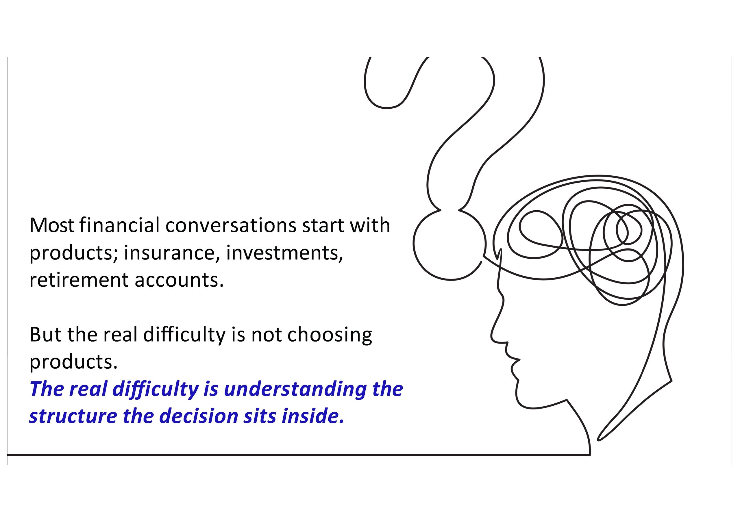 The work focuses on helping individuals step back and see how the different elements of their financial life relate to one another over time.